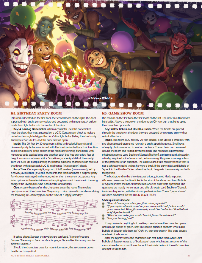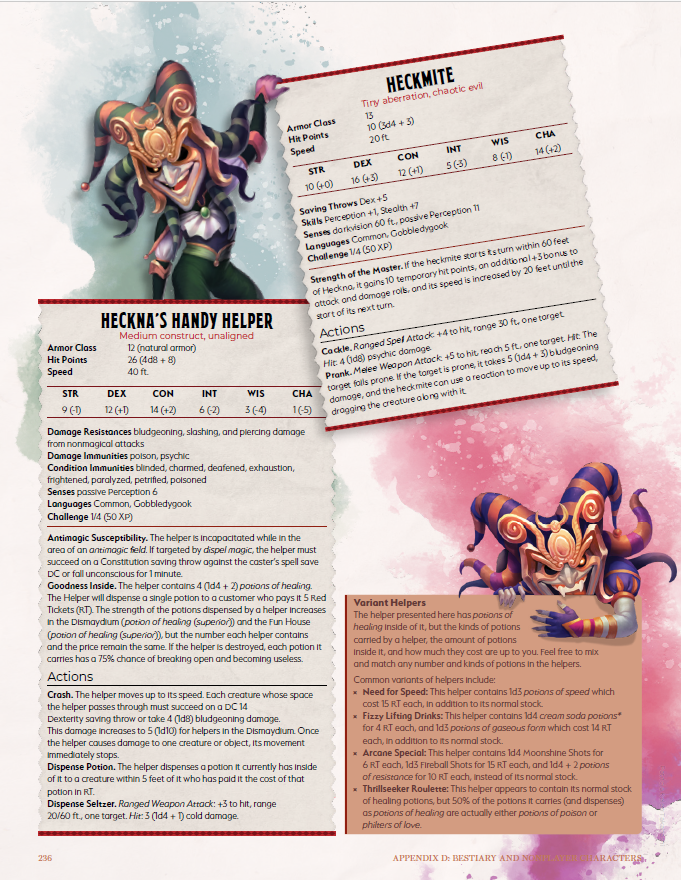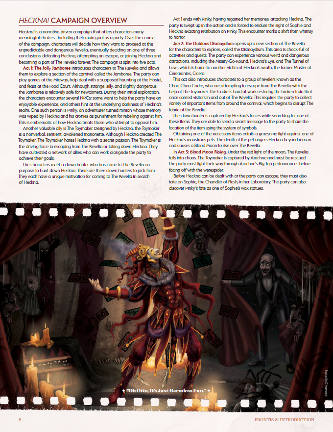 Heckna! is a 5e adventure designed for characters of levels 1 through 10. GMs and players alike will delight in this hilariously horrifying and wickedly whimsical dark carnival setting!